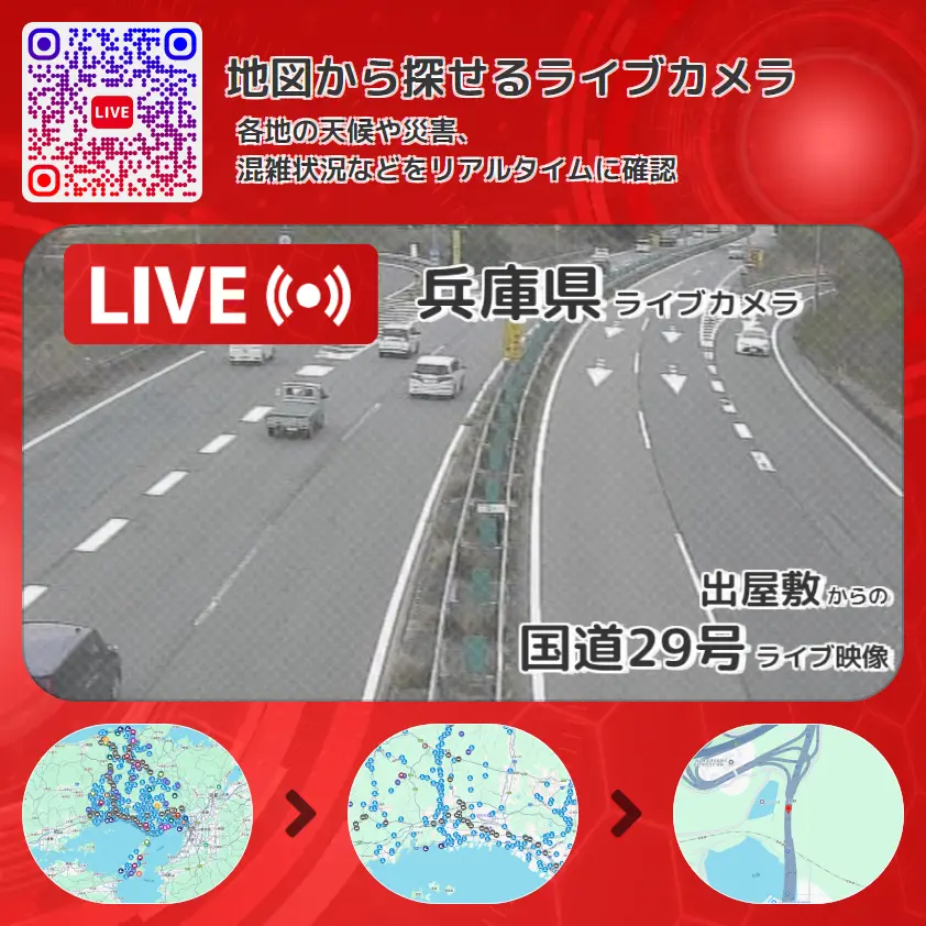 周辺の気象状況も併せてチェックすることが可能で、台風・大雨・地震などの災害による被害状況も把握することができます。
