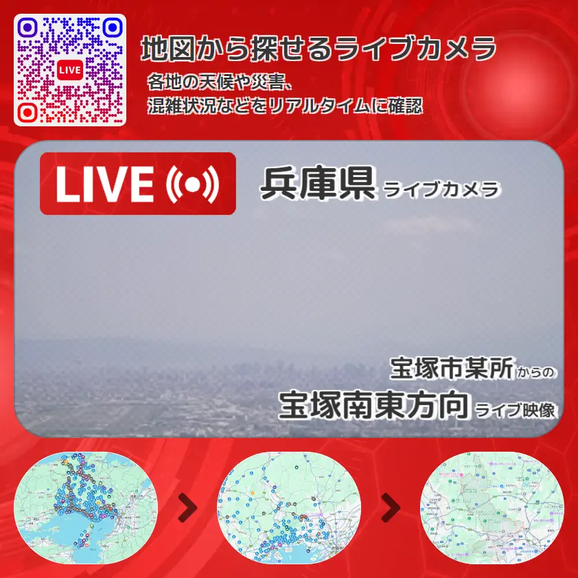 宝塚南東方向(伊丹市・尼崎市園田地区・豊中市豊南地区・大阪市方面)上空の他に、大阪国際空港(伊丹空港)や周辺の気象状況も併せてチェックすることが可能で、台風・大雨・地震などの災害による被害状況も把握することができます。