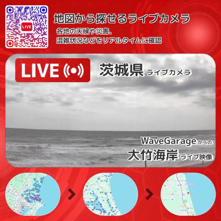 大竹海岸の他に、大竹海岸鉾田海水浴場や周辺の気象状況も併せてチェックすることが可能で、台風・大雨・地震などの災害による被害状況も把握することができます。