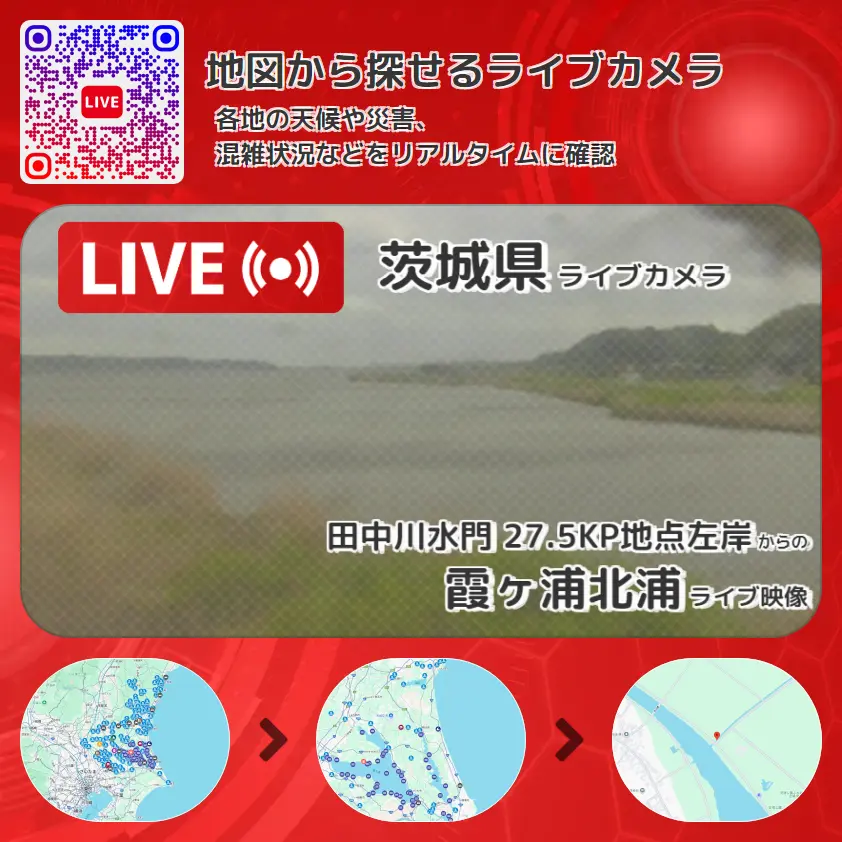 周辺の気象状況も併せてチェックすることが可能で、台風・大雨・地震などの災害による被害状況も把握することができます。
