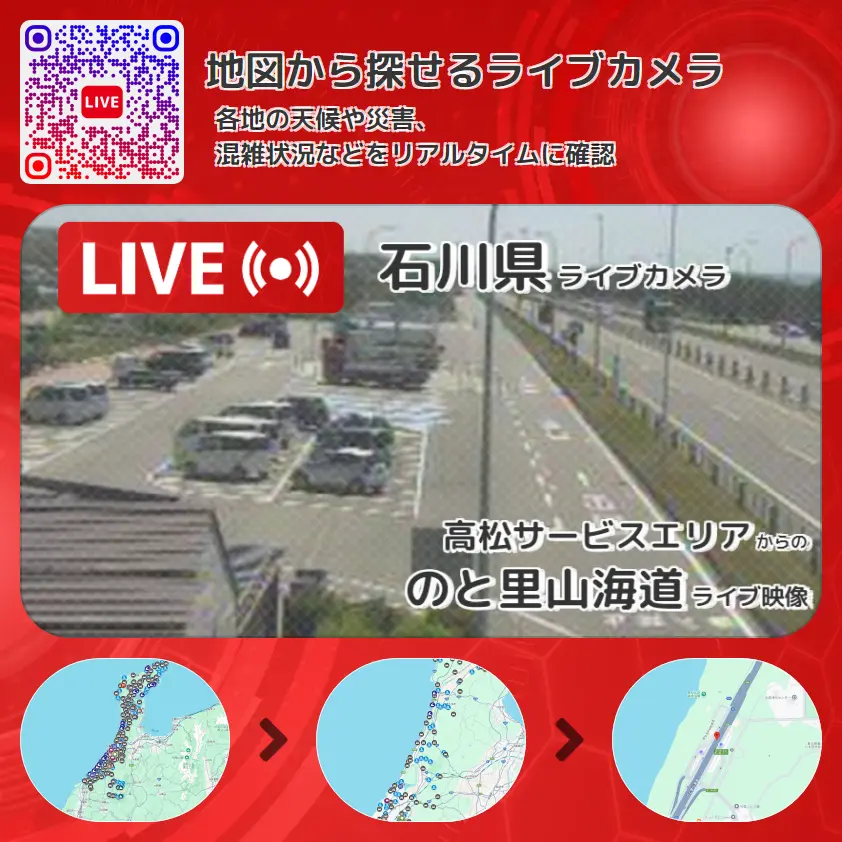 のと里山海道(石川県道60号金沢田鶴浜線)の他に、日本海や周辺の気象状況も併せてチェックすることが可能で、台風・大雨・地震などの災害による被害状況も把握することができます。