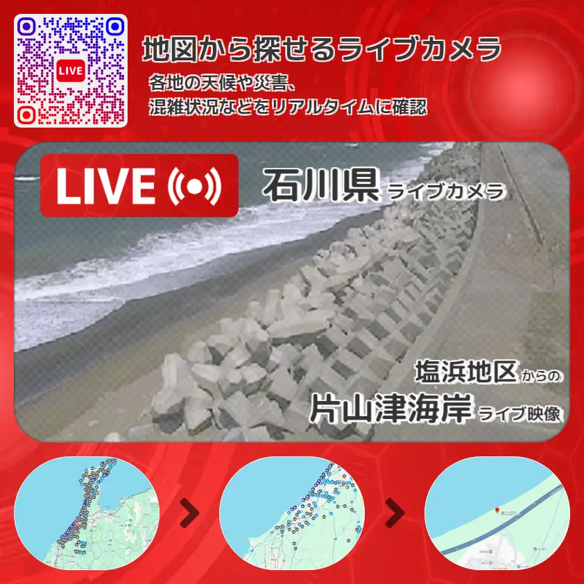 片山津海岸の他に、日本海や周辺の気象状況も併せてチェックすることが可能で、台風・大雨・地震などの災害による被害状況も把握することができます。