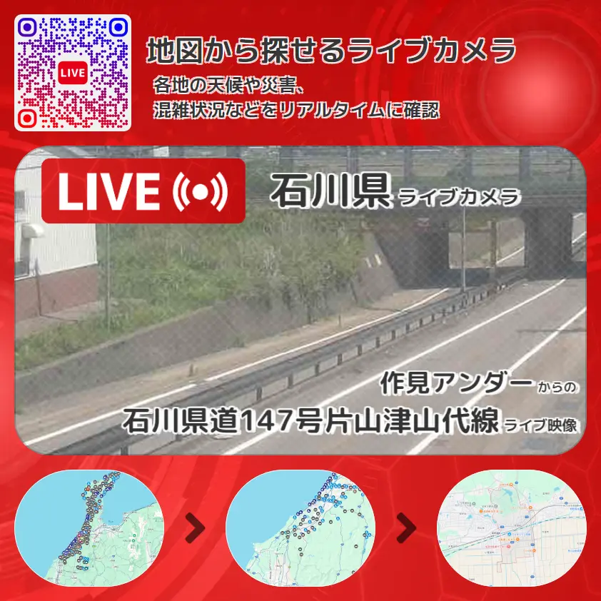 石川県道147号片山津山代線の他に、JR北陸本線や周辺の気象状況も併せてチェックすることが可能で、台風・大雨・地震などの災害による被害状況も把握することができます。