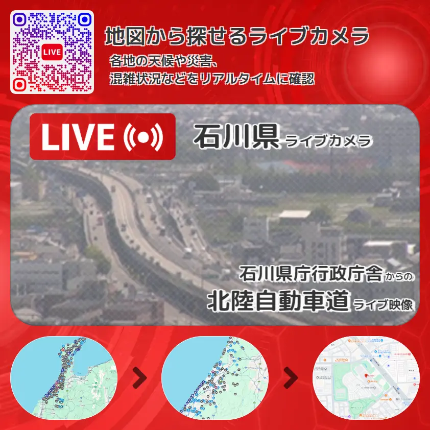 北陸自動車道(金沢高架橋)の他に、国道8号(金沢バイパス)や周辺の気象状況も併せてチェックすることが可能で、台風・大雨・地震などの災害による被害状況も把握することができます。