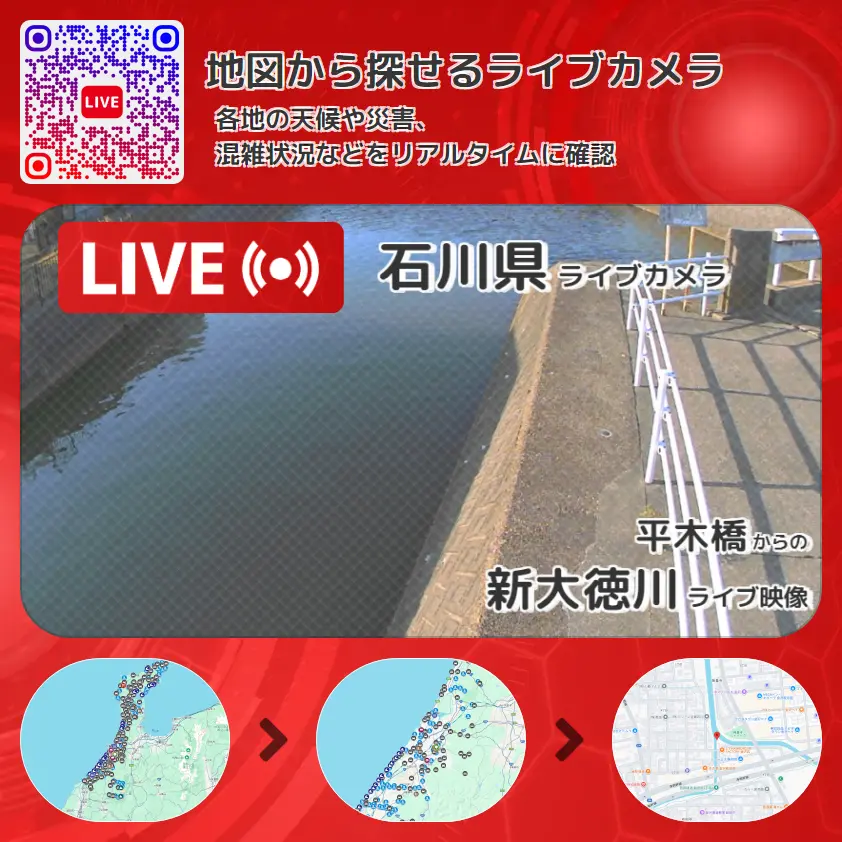 新大徳川の他に、畝田放水路や周辺の気象状況も併せてチェックすることが可能で、台風・大雨・地震などの災害による被害状況も把握することができます。