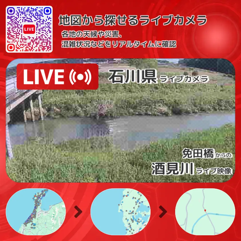 酒見川の他に、免田橋や周辺の気象状況も併せてチェックすることが可能で、台風・大雨・地震などの災害による被害状況も把握することができます。