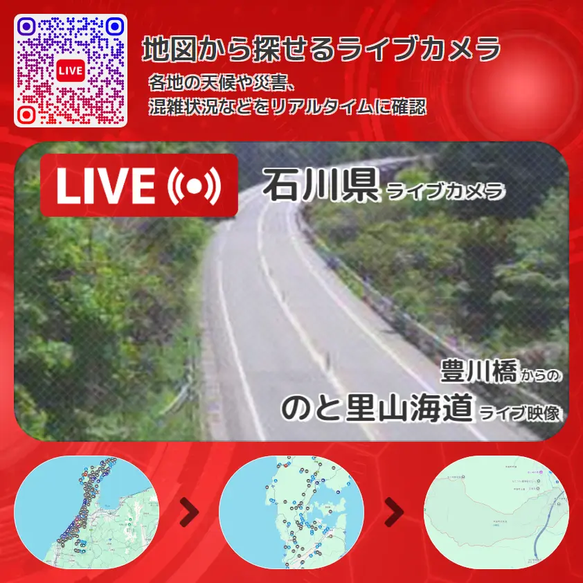 のと里山海道(石川県道1号七尾輪島線)の他に、徳田大津インターチェンジ(徳田大津IC)~横田インターチェンジ(横田IC)や周辺の気象状況も併せてチェックすることが可能で、台風・大雨・地震などの災害による被害状況も把握することができます。