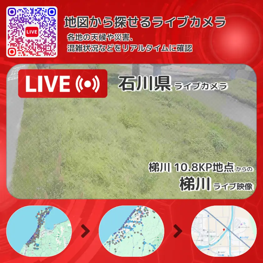 梯川の他に、滓上川や周辺の気象状況も併せてチェックすることが可能で、台風・大雨・地震などの災害による被害状況も把握することができます。