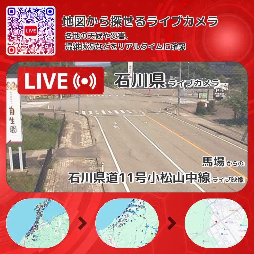 石川県道11号小松山中線の他に、加賀伝統工芸村ゆのくにの森や周辺の気象状況も併せてチェックすることが可能で、台風・大雨・地震などの災害による被害状況も把握することができます。