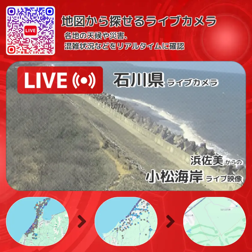 小松海岸の他に、日本海や周辺の気象状況も併せてチェックすることが可能で、台風・大雨・地震などの災害による被害状況も把握することができます。