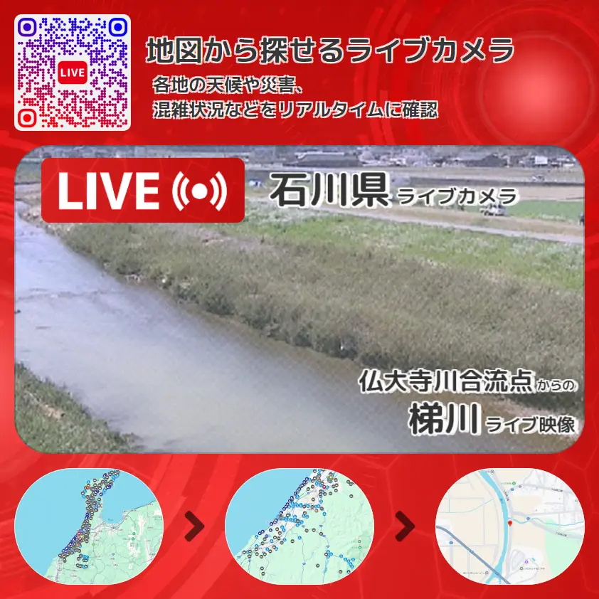梯川の他に、仏大寺川や周辺の気象状況も併せてチェックすることが可能で、台風・大雨・地震などの災害による被害状況も把握することができます。