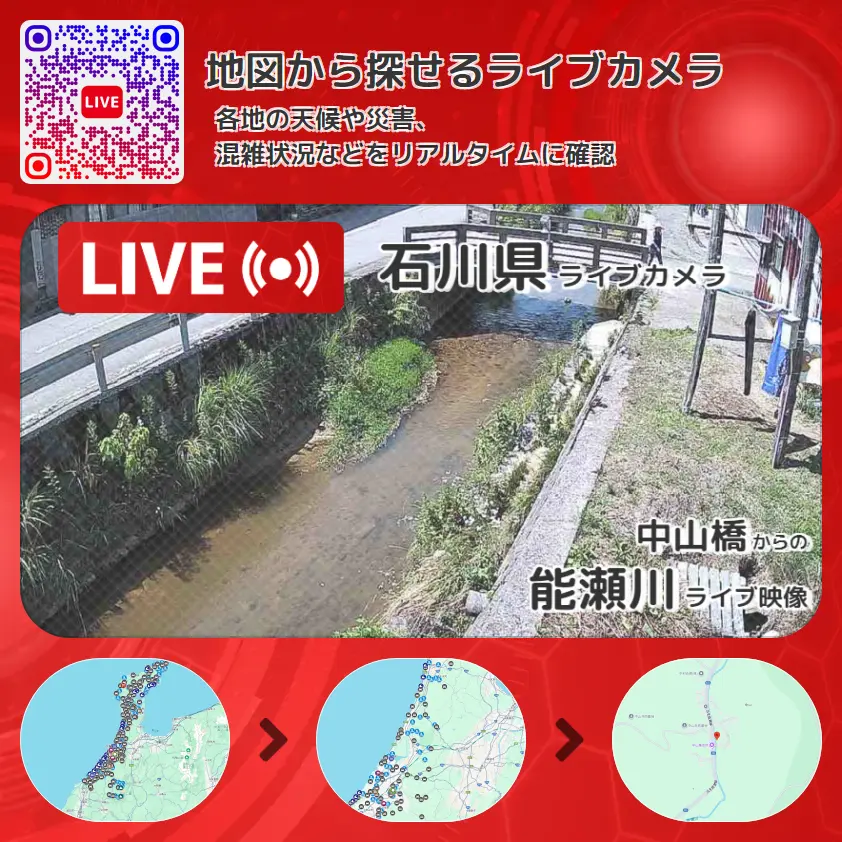 能瀬川の他に、石川県道221号瓜生能瀬線や周辺の気象状況も併せてチェックすることが可能で、台風・大雨・地震などの災害による被害状況も把握することができます。