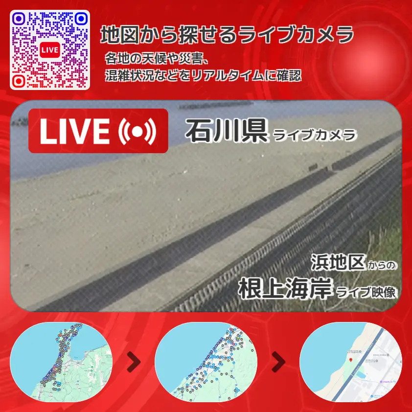 根上海岸の他に、日本海や周辺の気象状況も併せてチェックすることが可能で、台風・大雨・地震などの災害による被害状況も把握することができます。