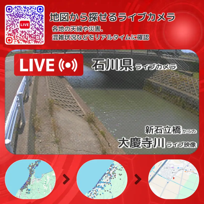 大慶寺川の他に、新石立橋や周辺の気象状況も併せてチェックすることが可能で、台風・大雨・地震などの災害による被害状況も把握することができます。