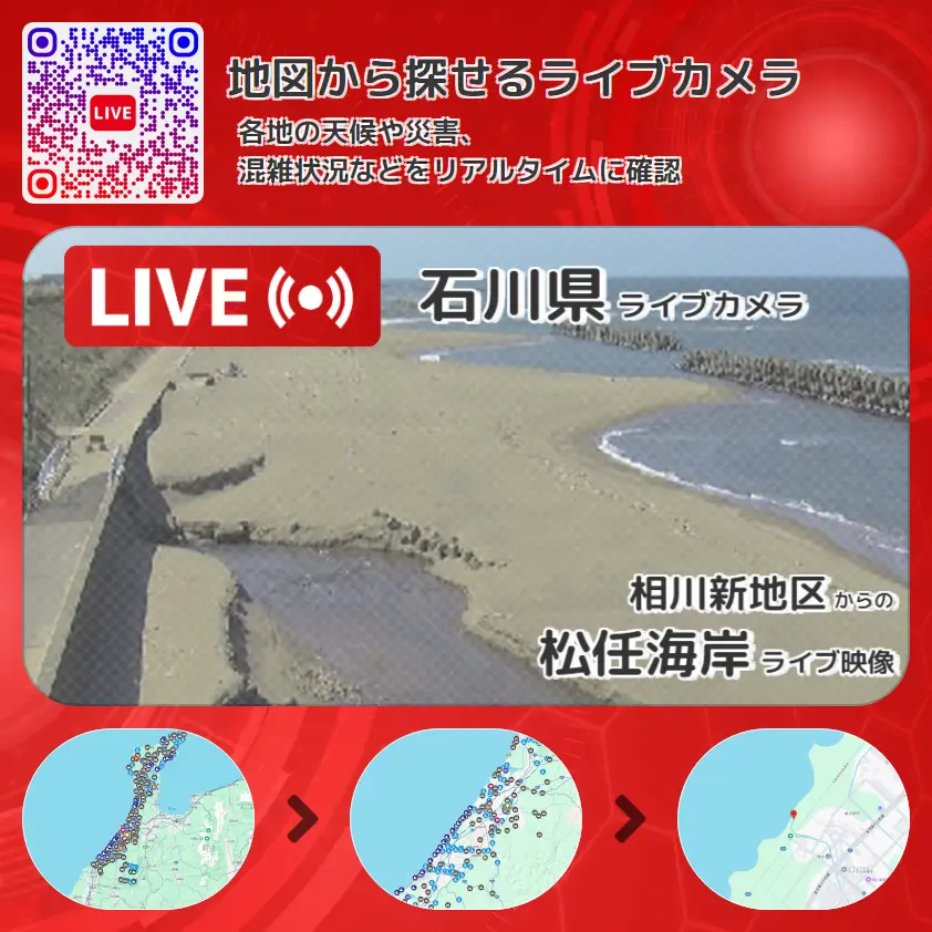 松任海岸の他に、日本海や周辺の気象状況も併せてチェックすることが可能で、台風・大雨・地震などの災害による被害状況も把握することができます。