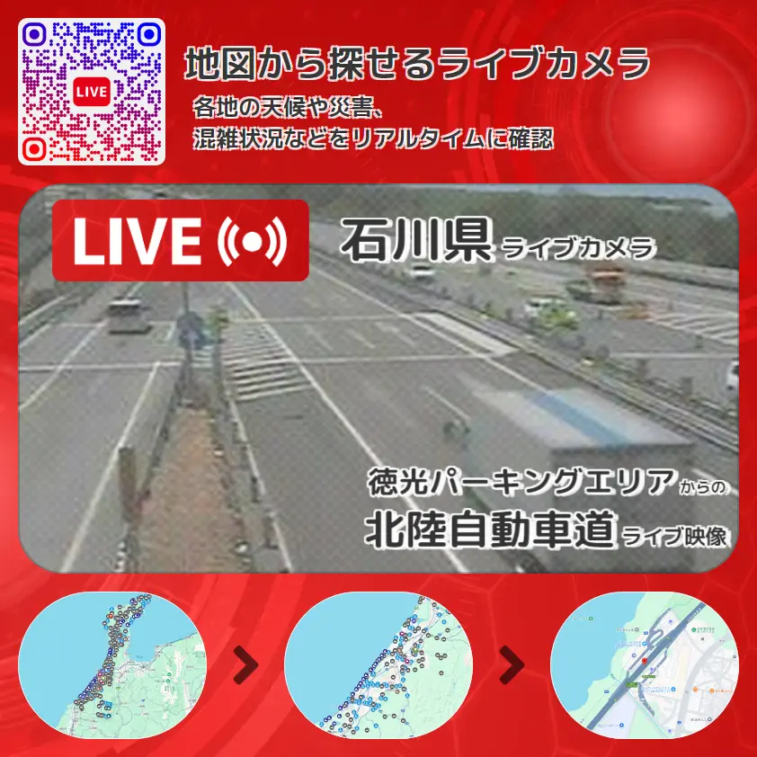 周辺の気象状況も併せてチェックすることが可能で、台風・大雨・地震などの災害による被害状況も把握することができます。