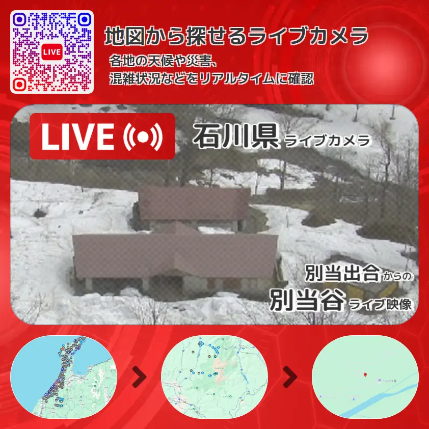 別当谷の他に、別当出合登山センターや周辺の気象状況も併せてチェックすることが可能で、台風・大雨・地震などの災害による被害状況も把握することができます。