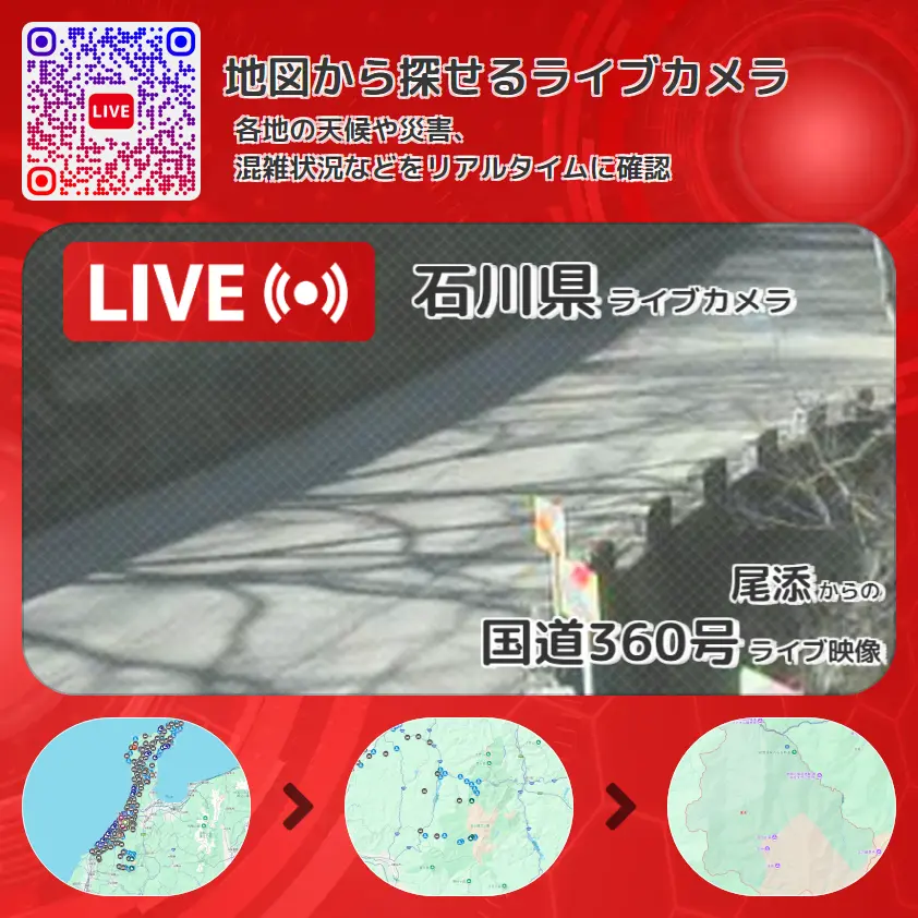 周辺の気象状況も併せてチェックすることが可能で、台風・大雨・地震などの災害による被害状況も把握することができます。