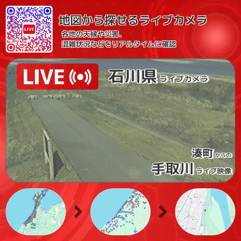 手取川の他に、熊田川や周辺の気象状況も併せてチェックすることが可能で、台風・大雨・地震などの災害による被害状況も把握することができます。
