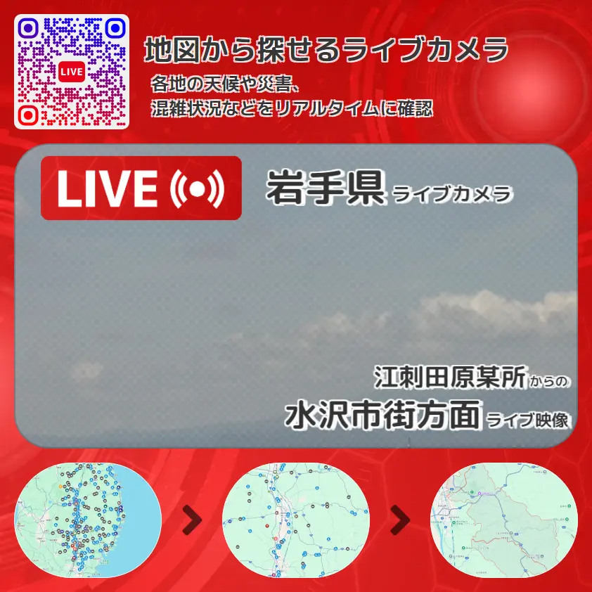 水沢市街方面の他に、衣川国見平スキー場や周辺の気象状況も併せてチェックすることが可能で、台風・大雨・地震などの災害による被害状況も把握することができます。