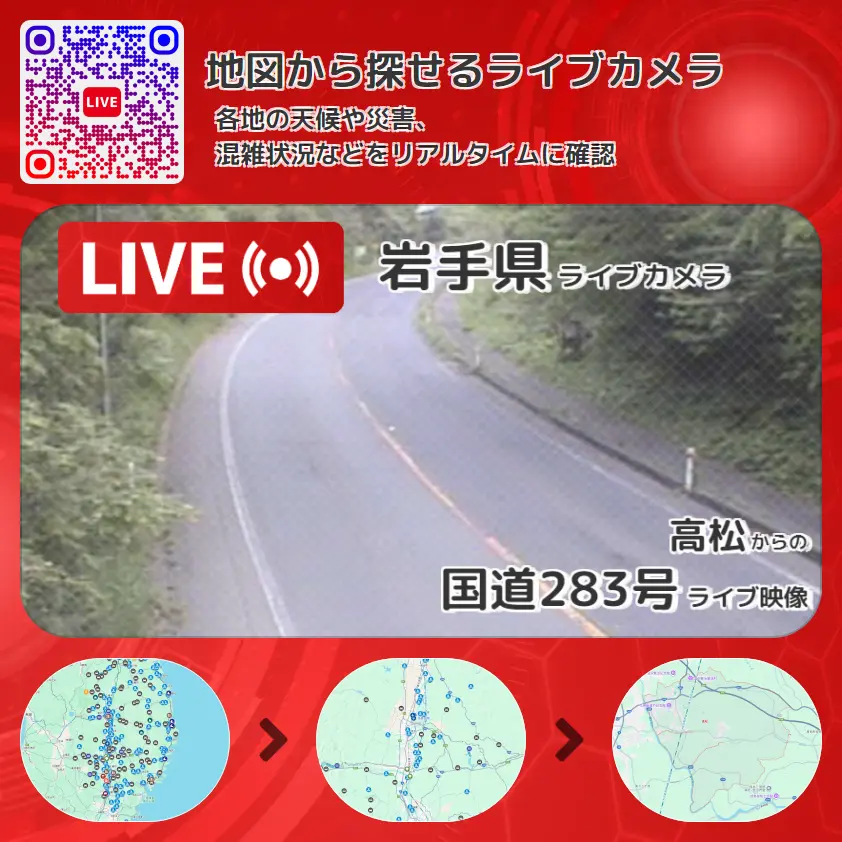 周辺の気象状況も併せてチェックすることが可能で、台風・大雨・地震などの災害による被害状況も把握することができます。