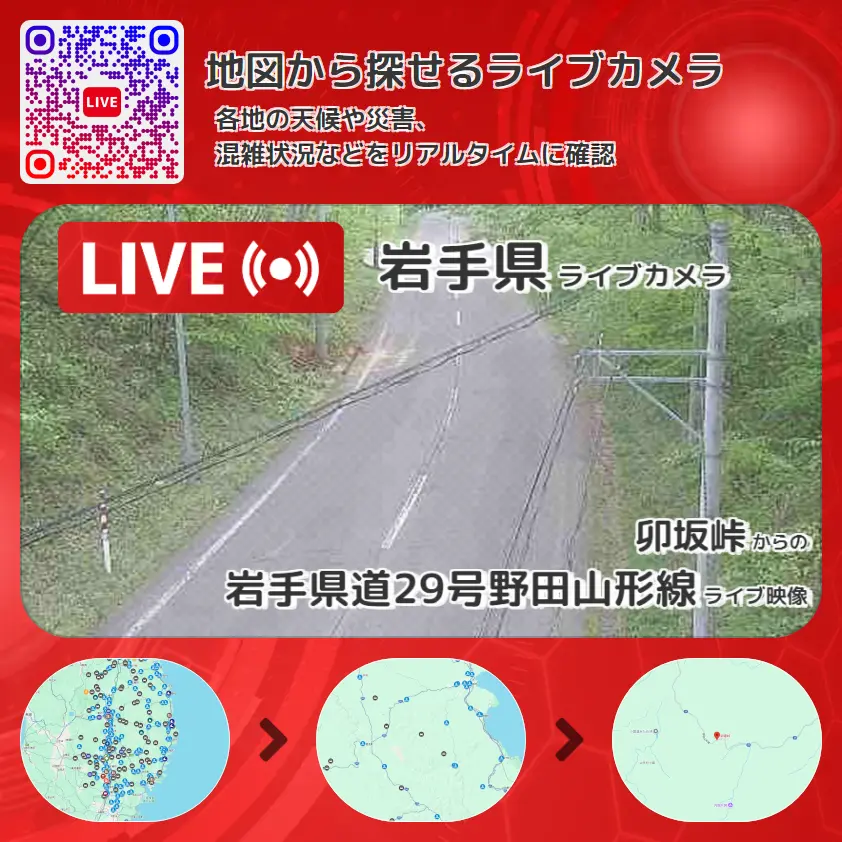 卯坂峠から、岩手県道29号野田山形線が確認できるライブカメラです。