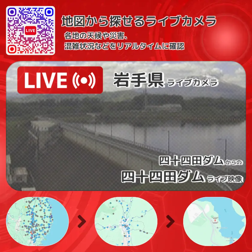 四十四田ダムの他に、岩手山や周辺の気象状況も併せてチェックすることが可能で、台風・大雨・地震などの災害による被害状況も把握することができます。