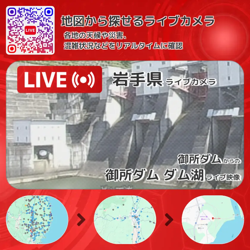 周辺の気象状況も併せてチェックすることが可能で、台風・大雨・地震などの災害による被害状況も把握することができます。