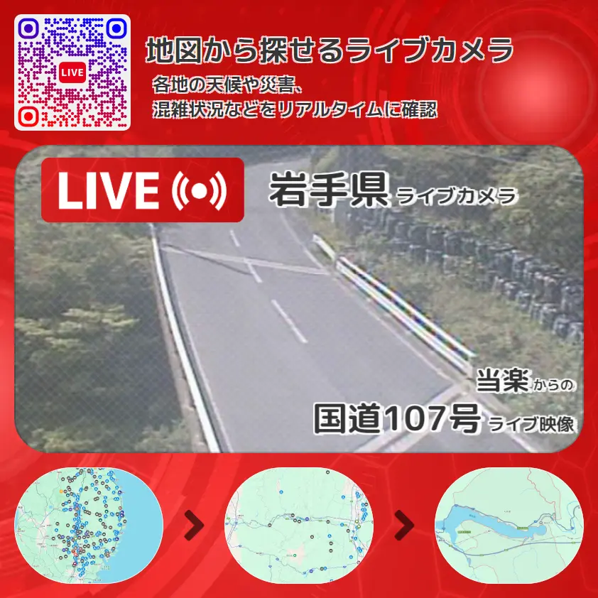 周辺の気象状況も併せてチェックすることが可能で、台風・大雨・地震などの災害による被害状況も把握することができます。