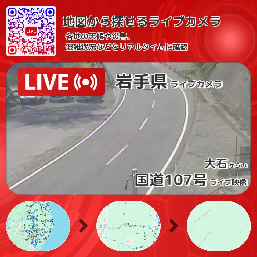 周辺の気象状況も併せてチェックすることが可能で、台風・大雨・地震などの災害による被害状況も把握することができます。