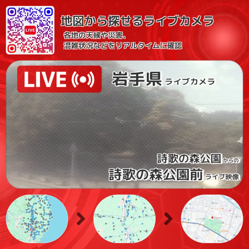 周辺の気象状況も併せてチェックすることが可能で、台風・大雨・地震などの災害による被害状況も把握することができます。