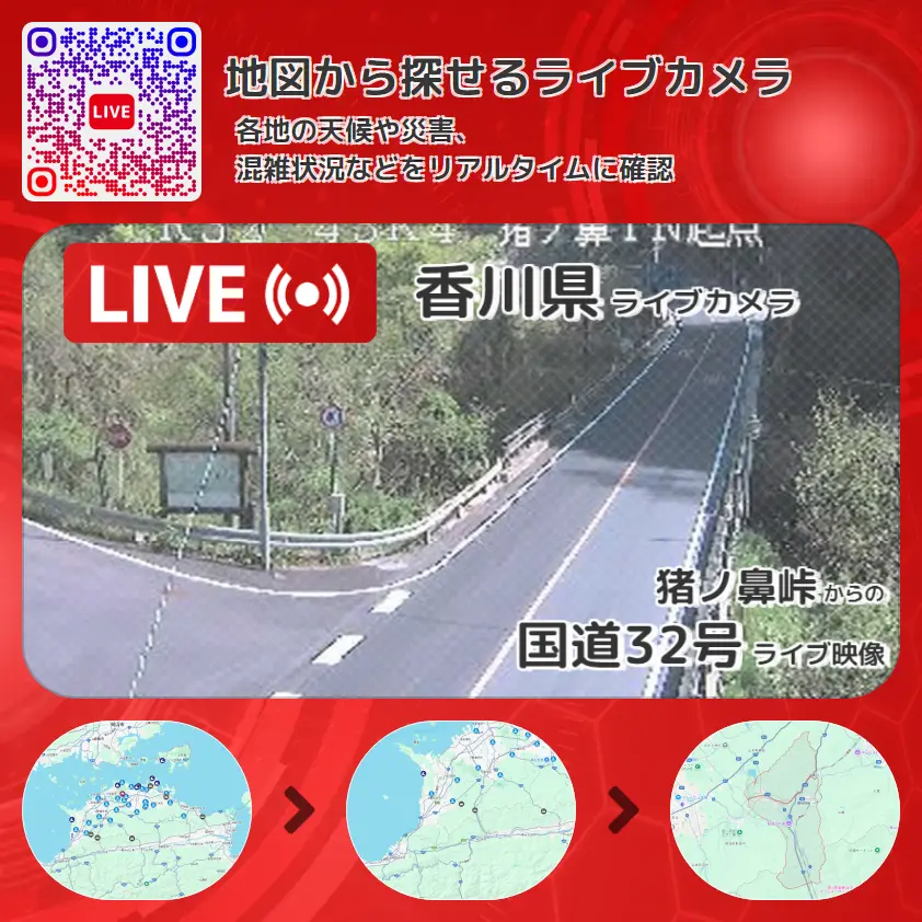 国道32号(阿波別街道)の他に、猪ノ鼻峠や周辺の気象状況も併せてチェックすることが可能で、台風・大雨・地震などの災害による被害状況も把握することができます。
