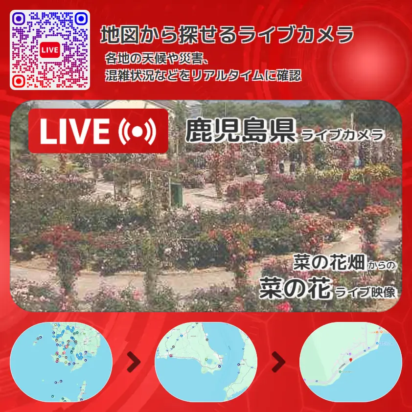 菜の花の他に、池田湖や周辺の気象状況も併せてチェックすることが可能で、台風・大雨・地震などの災害による被害状況も把握することができます。