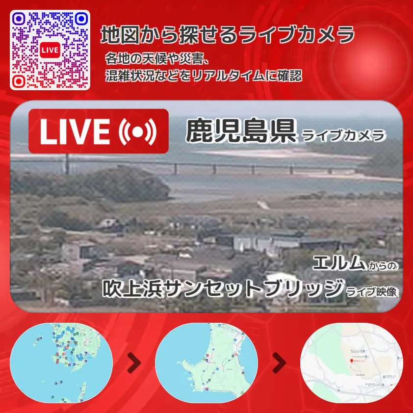 吹上浜サンセットブリッジの他に、サンセットポイントや周辺の気象状況も併せてチェックすることが可能で、台風・大雨・地震などの災害による被害状況も把握することができます。