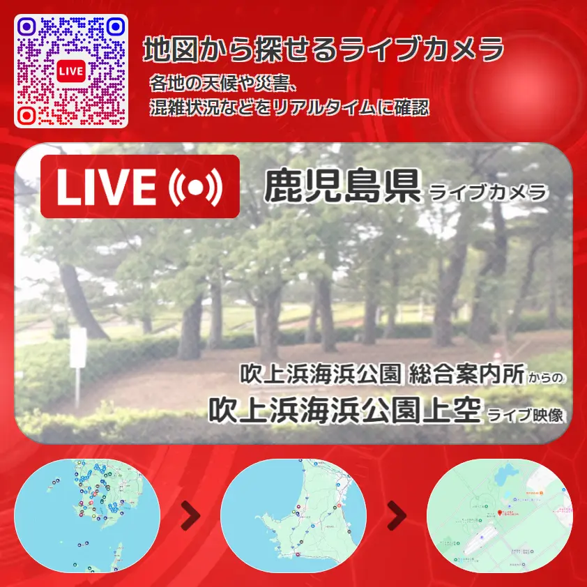 吹上浜海浜公園上空の他に、売店や周辺の気象状況も併せてチェックすることが可能で、台風・大雨・地震などの災害による被害状況も把握することができます。