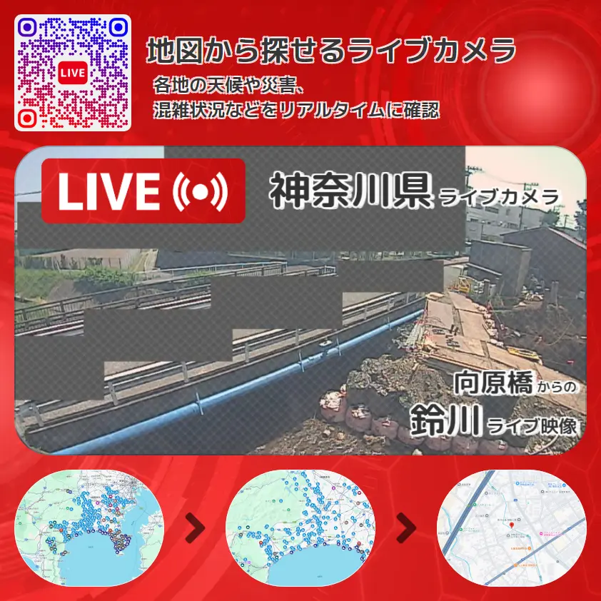 鈴川の他に、向原橋や周辺の気象状況も併せてチェックすることが可能で、台風・大雨・地震などの災害による被害状況も把握することができます。