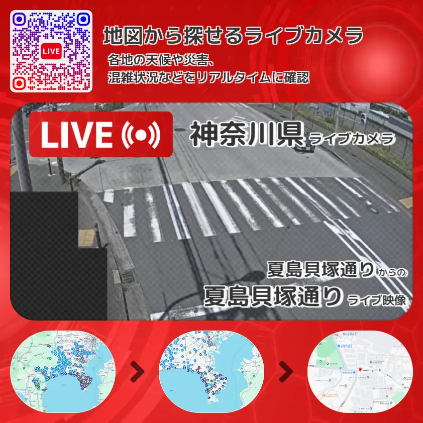 夏島貝塚通りの他に、横須賀スタジアム付近や周辺の気象状況も併せてチェックすることが可能で、台風・大雨・地震などの災害による被害状況も把握することができます。