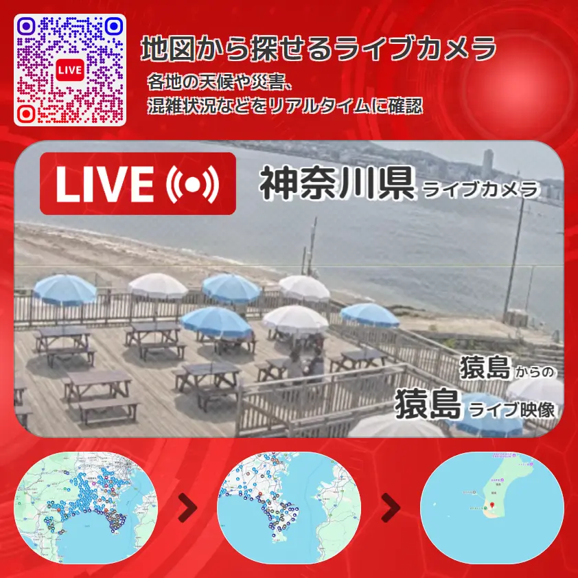 猿島(無人島)の他に、猿島海水浴場(猿島ビーチ)や周辺の気象状況も併せてチェックすることが可能で、台風・大雨・地震などの災害による被害状況も把握することができます。