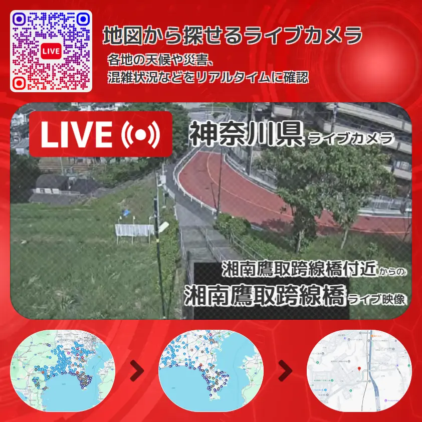 湘南鷹取跨線橋の他に、国道16号(横須賀街道)や周辺の気象状況も併せてチェックすることが可能で、台風・大雨・地震などの災害による被害状況も把握することができます。