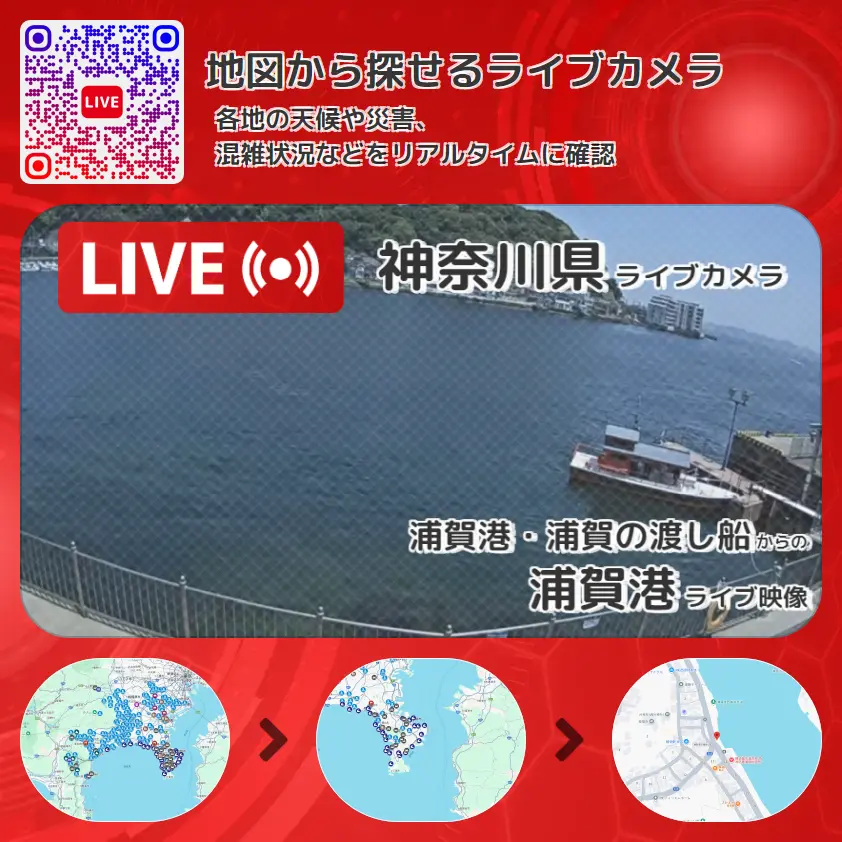 浦賀港・浦賀の渡し船(西渡船場)・浦賀港西岸遊歩道・浦賀警察署浦賀港交番付近・横須賀市南消防署浦賀出張所付近から、浦賀港が確認できるライブカメラです。
