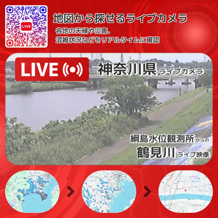 鶴見川の他に、大綱橋や周辺の気象状況も併せてチェックすることが可能で、台風・大雨・地震などの災害による被害状況も把握することができます。