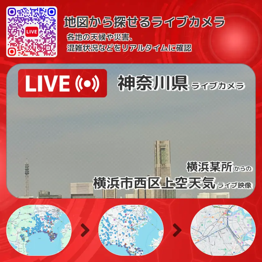 横浜市西区上空天気の他に、横浜ランドマークタワーや周辺の気象状況も併せてチェックすることが可能で、台風・大雨・地震などの災害による被害状況も把握することができます。
