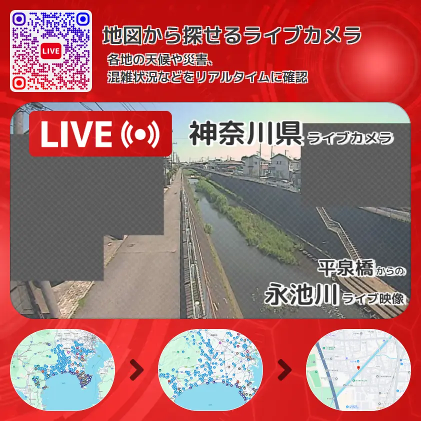 周辺の気象状況も併せてチェックすることが可能で、台風・大雨・地震などの災害による被害状況も把握することができます。