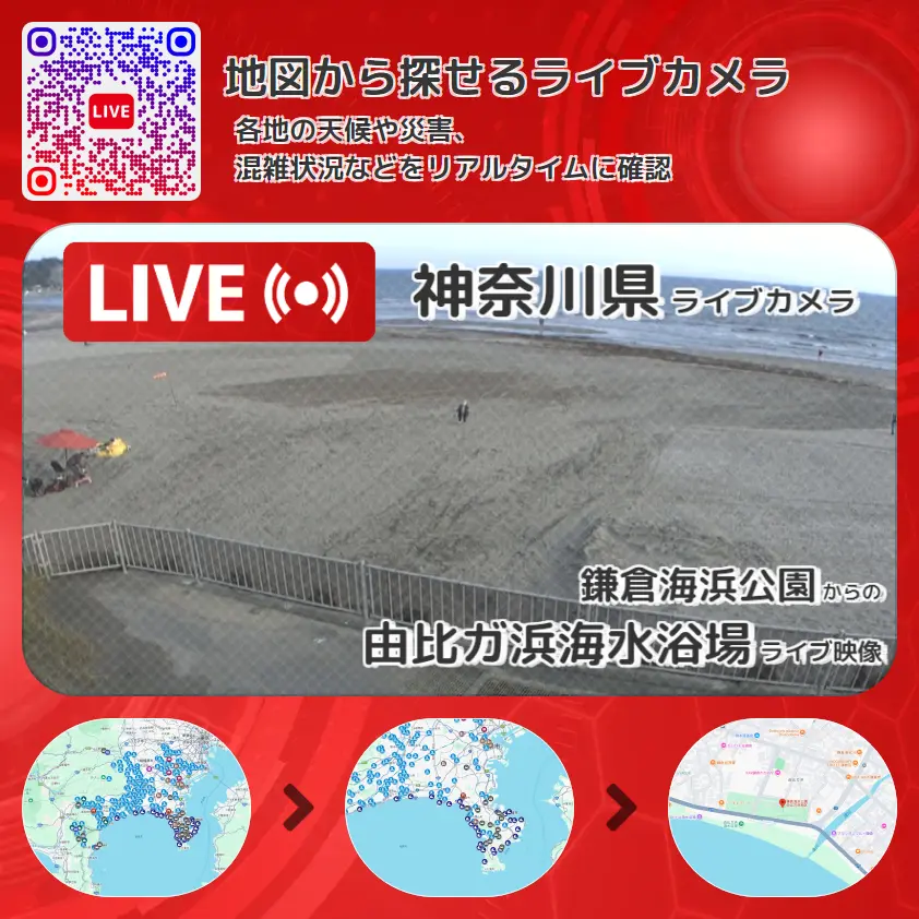 由比ガ浜海水浴場の他に、鎌倉海岸海上や周辺の気象状況も併せてチェックすることが可能で、台風・大雨・地震などの災害による被害状況も把握することができます。