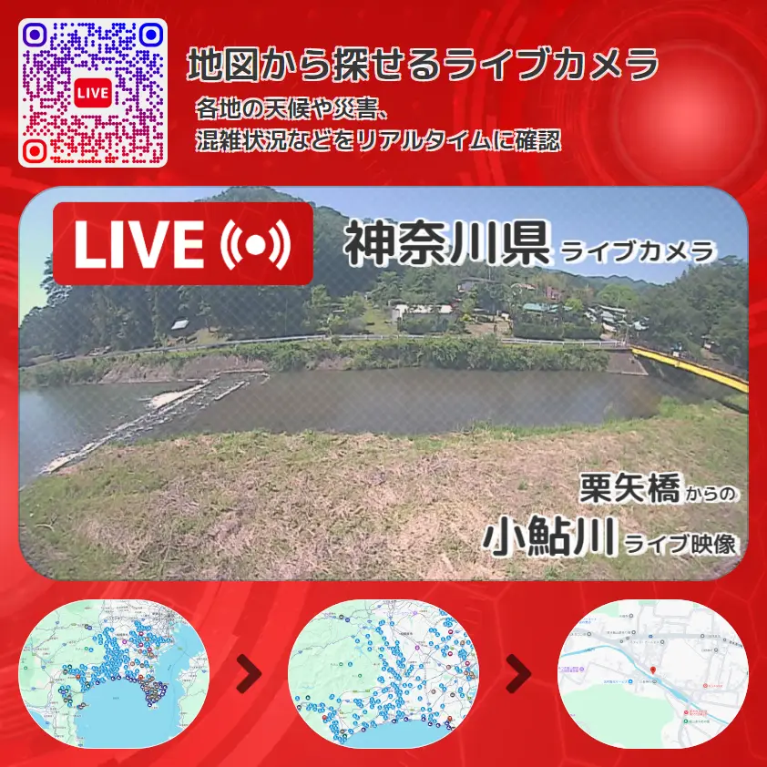 小鮎川の他に、栗矢橋や周辺の気象状況も併せてチェックすることが可能で、台風・大雨・地震などの災害による被害状況も把握することができます。