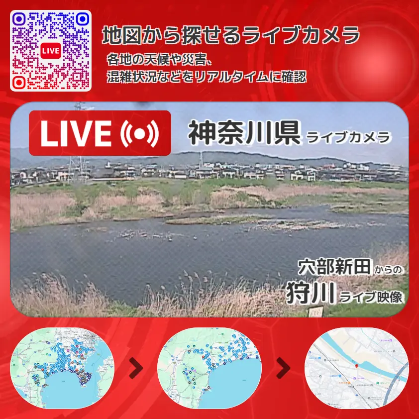 狩川の他に、螢田駅(小田急電鉄小田原線)方面や周辺の気象状況も併せてチェックすることが可能で、台風・大雨・地震などの災害による被害状況も把握することができます。