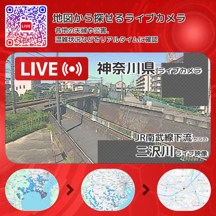 三沢川の他に、JR南武線(稲田堤駅~中野島駅間)や周辺の気象状況も併せてチェックすることが可能で、台風・大雨・地震などの災害による被害状況も把握することができます。