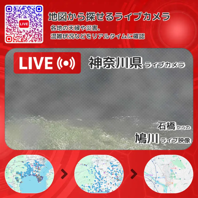 周辺の気象状況も併せてチェックすることが可能で、台風・大雨・地震などの災害による被害状況も把握することができます。