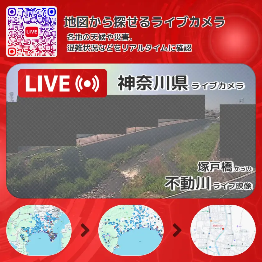 不動川の他に、塚戸橋や周辺の気象状況も併せてチェックすることが可能で、台風・大雨・地震などの災害による被害状況も把握することができます。