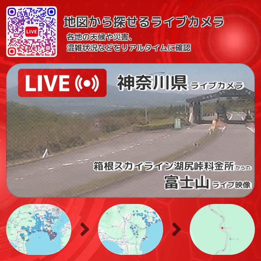 富士山の他に、箱根スカイラインや周辺の気象状況も併せてチェックすることが可能で、台風・大雨・地震などの災害による被害状況も把握することができます。